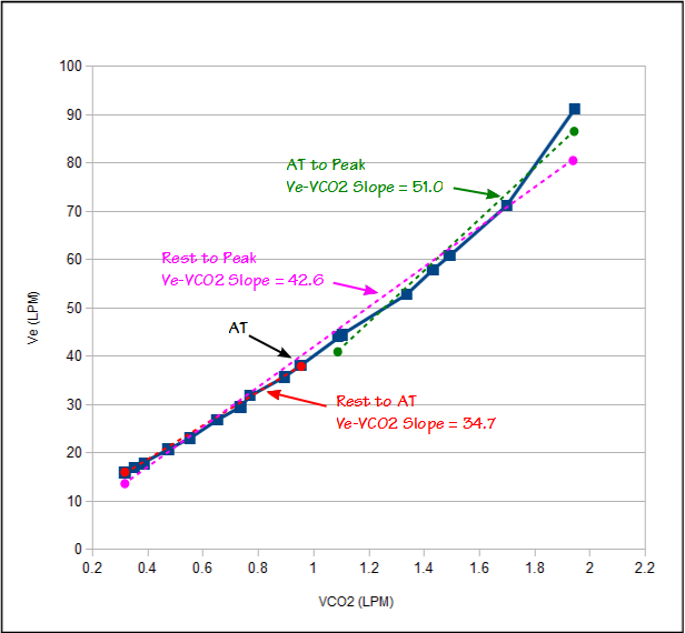 Ve and VCO2 have a reasonably linear relationship up to the anaerobic threshold. After the anaerobic threshold ventilation is driven by acidosis as well as CO2. This means that the Ve-VCO2 slope tends to be steeper (greater change in Ve per unit of VCO2) after anaerobic threshold than it was before. A Ve-VCO2 slope calculated from the entire CPET will therefore have steeper slope than one calculated using just using rest to AT.