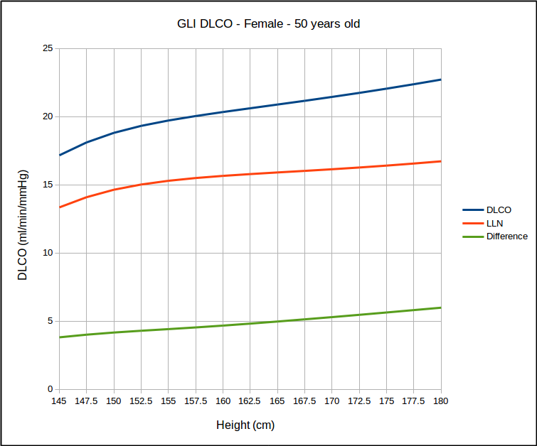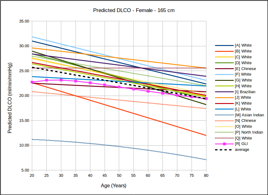 In the USA, the most commonly used DLCO reference equations are probably Crapo [A], Knudsen [F] and Miller [H]. With the sole exception of taller females the GLI predicted DLCO is noticeably lower than all of these, although in most instances the GLI is closest to Miller and furthest away from Knudsen.