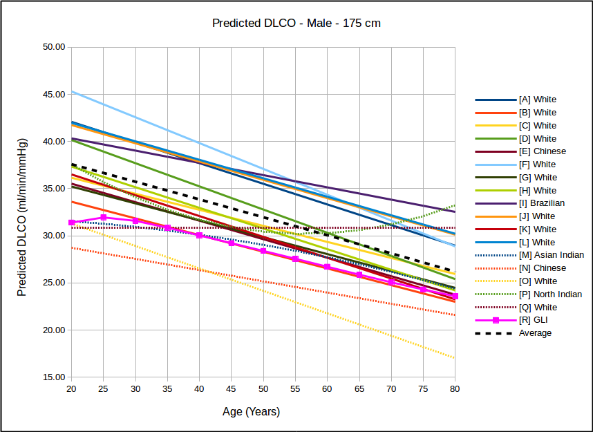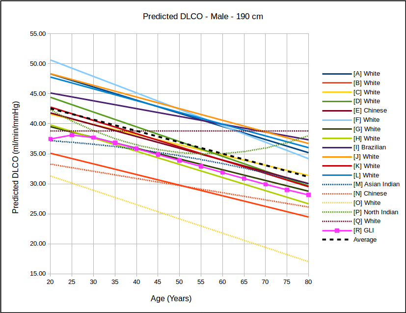 The data used to develop the GLI reference equations was originally derived from 19 studies the GLI identified to have been performed on lifetime nonsmoking populations. 85% of the results came from Caucasian populations and the remaining from two Asian sources. The authors felt that there weren’t a sufficient number of non-Caucasians to accurately describe any ethnicity-based differences in DLCO and for this reason only the Caucasian data was used.