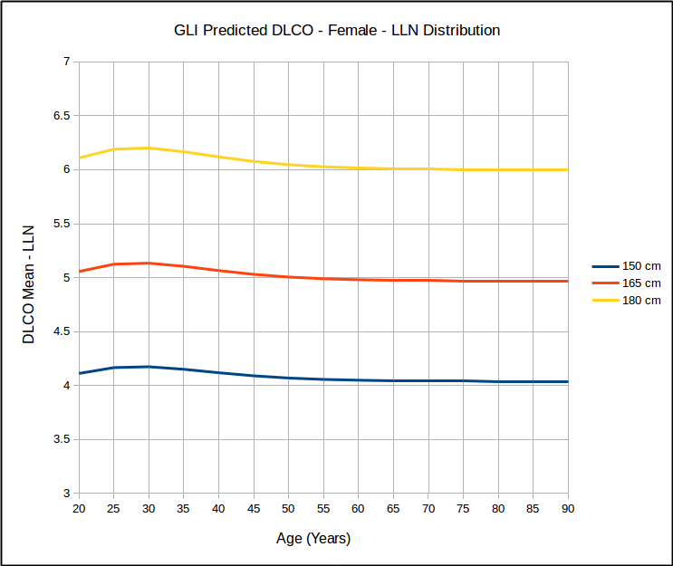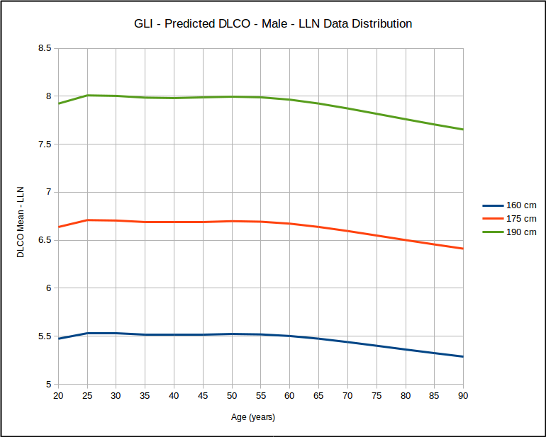 Over the years many researchers have contended that a statistical analysis of most pulmonary function results show a homoscedastic distribution of the results. Strictly speaking this means the the lower (and upper) limits of normal parallel the mean value and this has been the basis for using the SEE (Standard Error of the Estimate) x 1.645 as the LLN for DLCO reference equations that were originally published without an LLN. This notion has bothered me but I have neither the statistical background nor access to the original data in order to be able to test it. The GLI DLCO reference equations do show that as far as age is concerned that for the same height, the data looks somewhat homoscedastic.