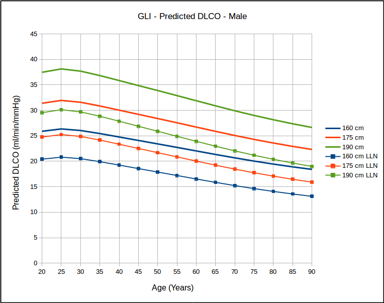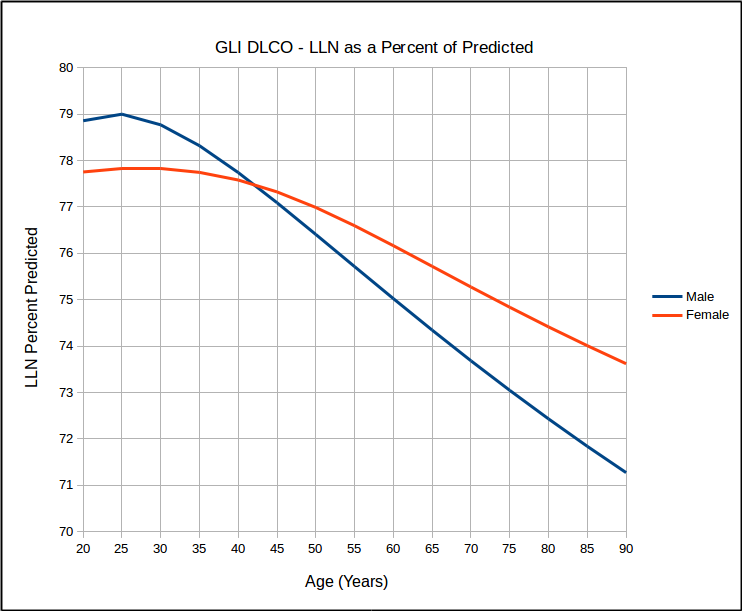 which in turn calls into question the use of 80% of predicted as stand-in for the LLN, particularly for the elderly. Interestingly, similar to the GLI spirometry reference equations, the GLI DLCO reference equations show that DLCO peaks in the early 20’s, which is different from all existing DLCO reference equations. Also of interest, DLCO appears to decline in a reasonable linear fashion with increasing age.