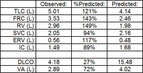 I had mentioned previously that my PFT Lab has been questioned why the percent predicted Residual Volume (RV) measurements on some research patients were coming out so much lower at my lab than at some other PFT Labs. At that time the researchers had not shared the results they had from these patients so we could only speculate that either our RV’s were actually lower or that the predicted RV values used by the other PFT Labs were different than ours. We finally got a copy of the PFT report for one of these patients and it turns out that both answers were correct.