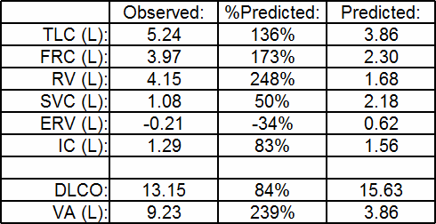 I am not, however, going to try to argue that my lab’s predicted values are better than those of Lab X, just that they are different. The ATS has not officially recommended any particular set of lung volume reference equations and I think it would be easy to argue that all current reference equations are flawed to one extent or another. I would like to know how they were derived at Lab X but that is just to satisfy my own curiosity. Using Lab X’s predicted RV, our measured RV was 179% of predicted where by our reference equations it was 152% of predicted. This explains part of the difference in percent predicted values but by no means all of it.