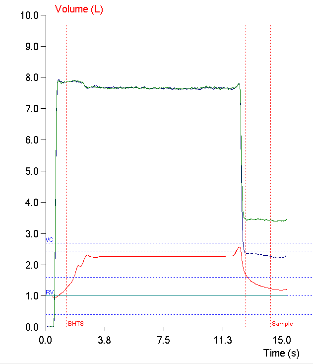 This was a suboptimal DLCO test and if there had been any alternative it would not have been reported. You often have to work with whatever a patient is capable of doing however and then it becomes important to have a good understanding of the tests so you can try to determine what effect their testing error has on the results. The most interesting thing about this test was that it pointed out a hole in the assumptions a lot of us have about breath-holding during the DLCO test.