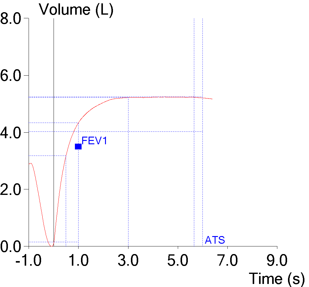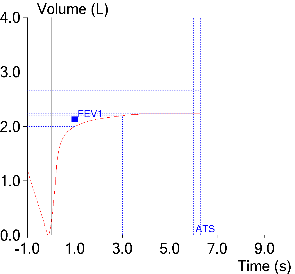 In addition, I’ve run across a couple spirometry systems that did not display or print a volume-time curve, and for these systems it is not possible to verify the reported expiratory time in any way. I would agree that a volume-time curve is not as informative as a flow-volume loop, but it is still useful as a way to verify a number of test quality issues that don’t appear (or don’t appear all that well) in a flow-volume loop.