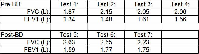 Since it showed pre- and post-BD volume-time curves that were fairly similar why were the volumes so different? Our test system software allows the FVC, FEV1 and the graphs to all be selected from different efforts so my suspicions at this point were that the technician performing the tests had selected these values from the wrong tests by accident. When I pulled up the raw test data I saw that the pre-BD spirometry results were somewhat similar, but they were all more than a half a liter less than the best post-BD FVC.