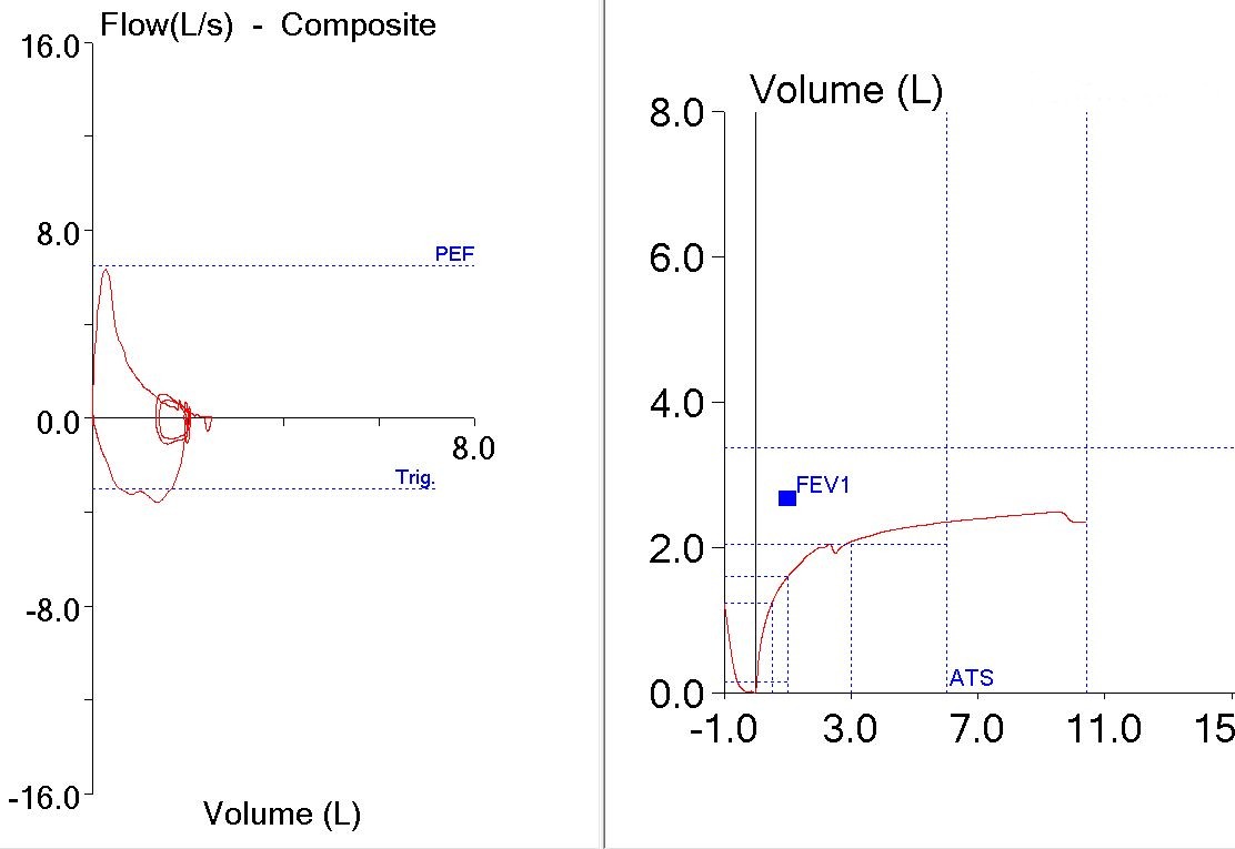Surprisingly enough the ATS/ERS statement on spirometry says nothing about stopping the test when a patient inhales and instead only says that the end-of-test criteria is satisfied when “the volume-time curve shows no change in volume (<0.025 L) for >= 1 second”. I have seen this type of expiratory pattern before (i.e. exhalation, short inhalation, continued exhalation) but when I looked at it in the past the software had measured the FVC volume correctly or at least the expiratory time matched the point at which the FVC volume was measured. This is the first time I’ve noticed a distinct discrepancy and it is not clear why this occurred. The software may have a certain inspiration threshold for determining an end of exhalation and in this case maybe it was exceeded where it hadn’t been in the past but again, if that’s the case why didn’t it apply to both volume and time?