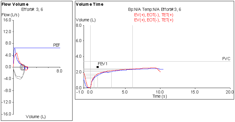 The patient had stopped exhaling around 2-1/2 seconds into the spirometry effort, inhaled a small amount of air and then continued exhaling for another 8 seconds. The test system software had used the volume from the 2-1/2 second point in the exhalation when reporting the FVC but for some reason had continued measuring time until the patient “really” stopped exhaling. This means that there were two end-of-tests for this effort, one for the volume and one for time.