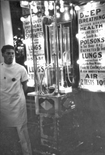 At the amusement parks, along with the carousels, ferris wheels and roller coasters there was the penny arcade and in amongst the penny arcade’s slot machines, strength testers, music machines, scales, gumball machines and electric shockers were the coin-operated spirometers. Coin operated spirometers started off with simple dials and quickly became elaborate amusements unto themselves.