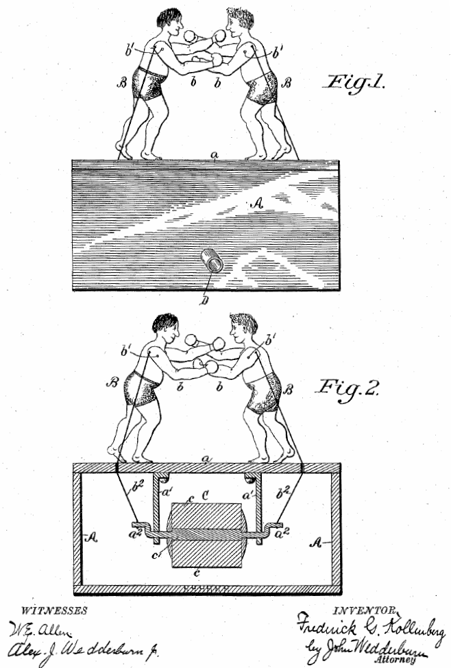 A spirometry “toy”. Blowing into the mechanism turned an internal paddle wheel which made the figures “box” with each other.