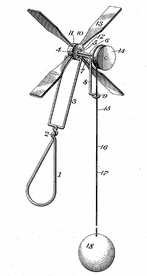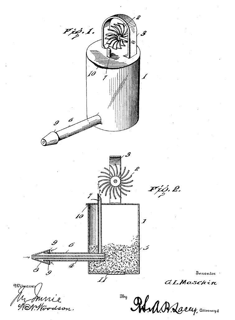 A “trick” spirometer. Blowing into the mouthpiece did cause the wheel to turn, but also caused a powder such as flour or pepper from inside the canister to be blown in the face of the unsuspecting user (slit 10 in the drawing). Some of these practical joke spirometers were made up to look like an arcade spirometer and would work like one too until a switch was turned or a lever was flipped for the next unwary user.
