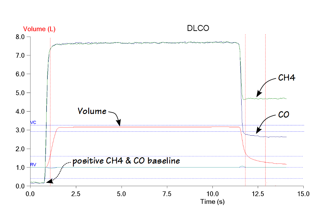 It’s possible to download the raw data from the DLCO test into a spreadsheet but since none of the computers attached to our test systems have spreadsheet software it can only be done from one of our desktop workstations. In addition the CO and CH4 are reported on the spreadsheet as fractional concentrations, and not as a percent of the inspired concentrations. It’s not real hard to convert back and forth, but is another step and all this tends to means that the baseline CH4 and CO aren’t easily available.
