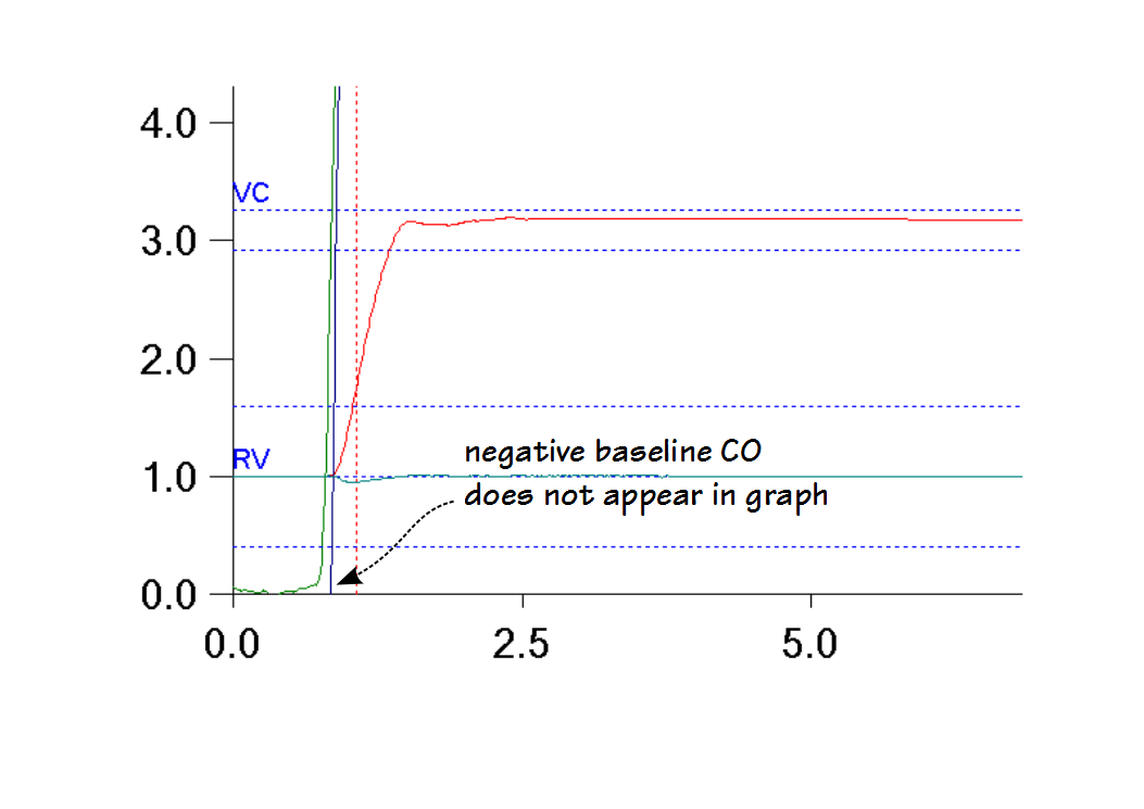 Anyway, the baseline CH4 and CO values should be close to zero and for the CH4 reading of 0.001 (+0.35%) this was true. The baseline CO reading however, was -0.194 (-63.9%) which means that for some reason the zero offset of the analyzer was way off and this in turn was causing the exhaled CO reading to be reduced as well.