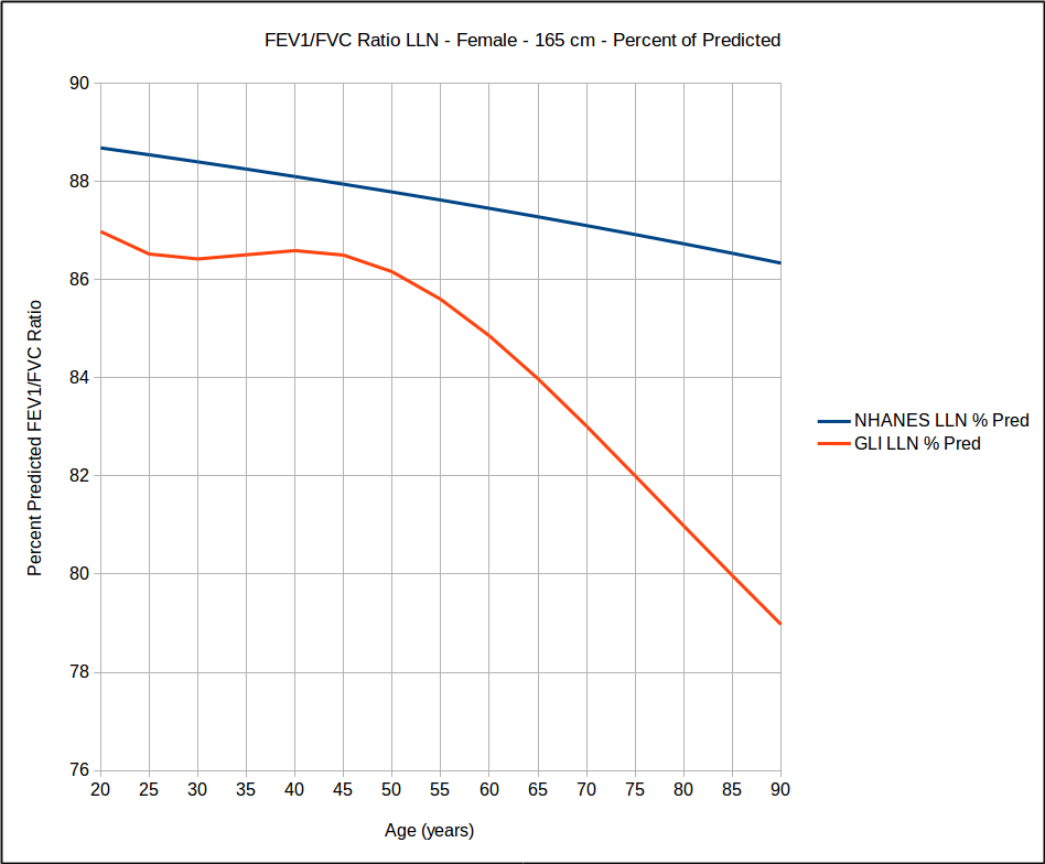 The FEV1/FVC ratio and its LLN is the starting point of the ATS/ERS interpretation algorithm so defining the LLN correctly is critical. The GLI reference equations make it quite clear that the LLN is not linear but viewing the FEV1/FVC ratio LLN by itself does not make its complexity as apparent as when it is viewed as a percent of the predicted FEV1/FVC ratio. I still have reservations that the GLI predicted FVC and FEV1 are a good match to my lab’s patient population but I think the overall behavior of the FEV1/FVC ratio’s LLN as described by its percent predicted is not only reasonably accurate, but that it is more accurate than the LLN from the NHANESIII or any other spirometry reference equations. For this reason I have no particular problem combining the GLI FEV1/FVC ratio’s percent predicted with the NHANESIII reference equations (not that I have a real choice since my lab’s software does not support the GLI reference equations).