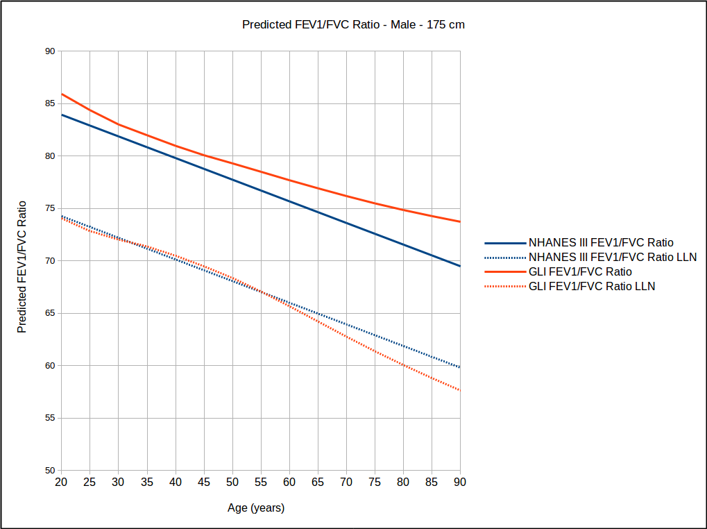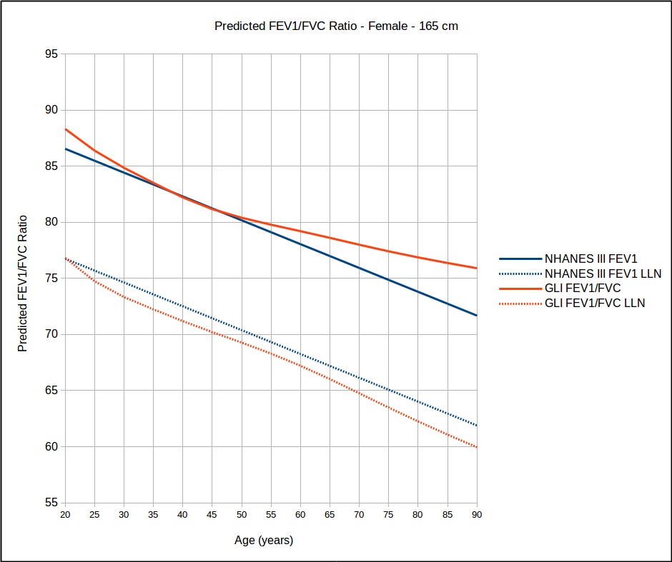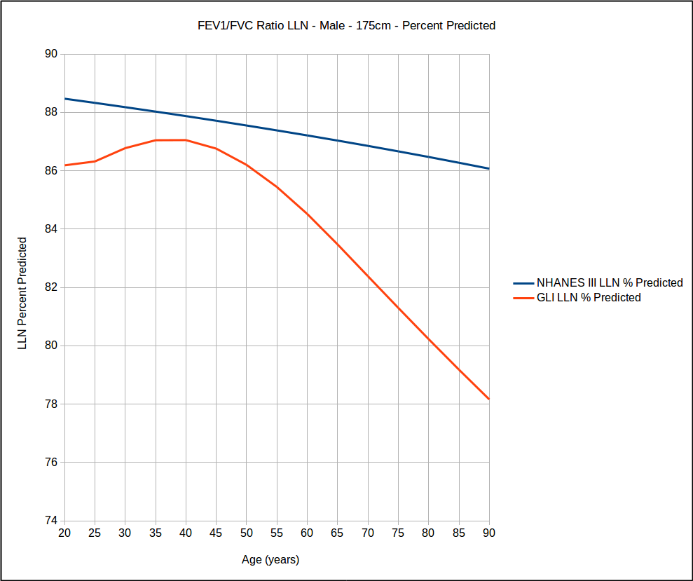 I do have a lot of respect for the GLI equations however, and think that the overall view they give of the normal distribution of FVC, FEV1 and the FEV1/FVC ratio is far more correct than those of any prior studies. Using a spreadsheet tool downloaded from the GLI that lets me generate the GLI spirometry predicted values and the NHANESIII reference equations I decided to take a closer look at their predicted FEV1/FVC ratios and their LLNs.